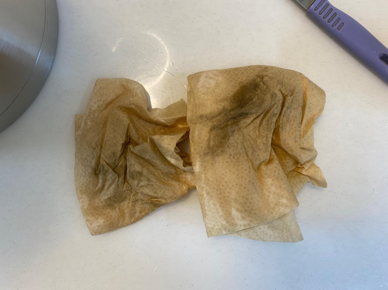 이미 STS 제품을 뜨거운 물로 연마한 면을 늘려준지라 뜨거운 물은 싱크대 볼에 보관하고 키친타월에 기름을 묻혀 연마제를 닦아 줍니다. 참고로 스테인리스 제품은 제조사에서 연마 후 연마제를 일부 제거를 하지만, 제거하는 후공정으로 완벽하게 제거해 주지 않습니다.
