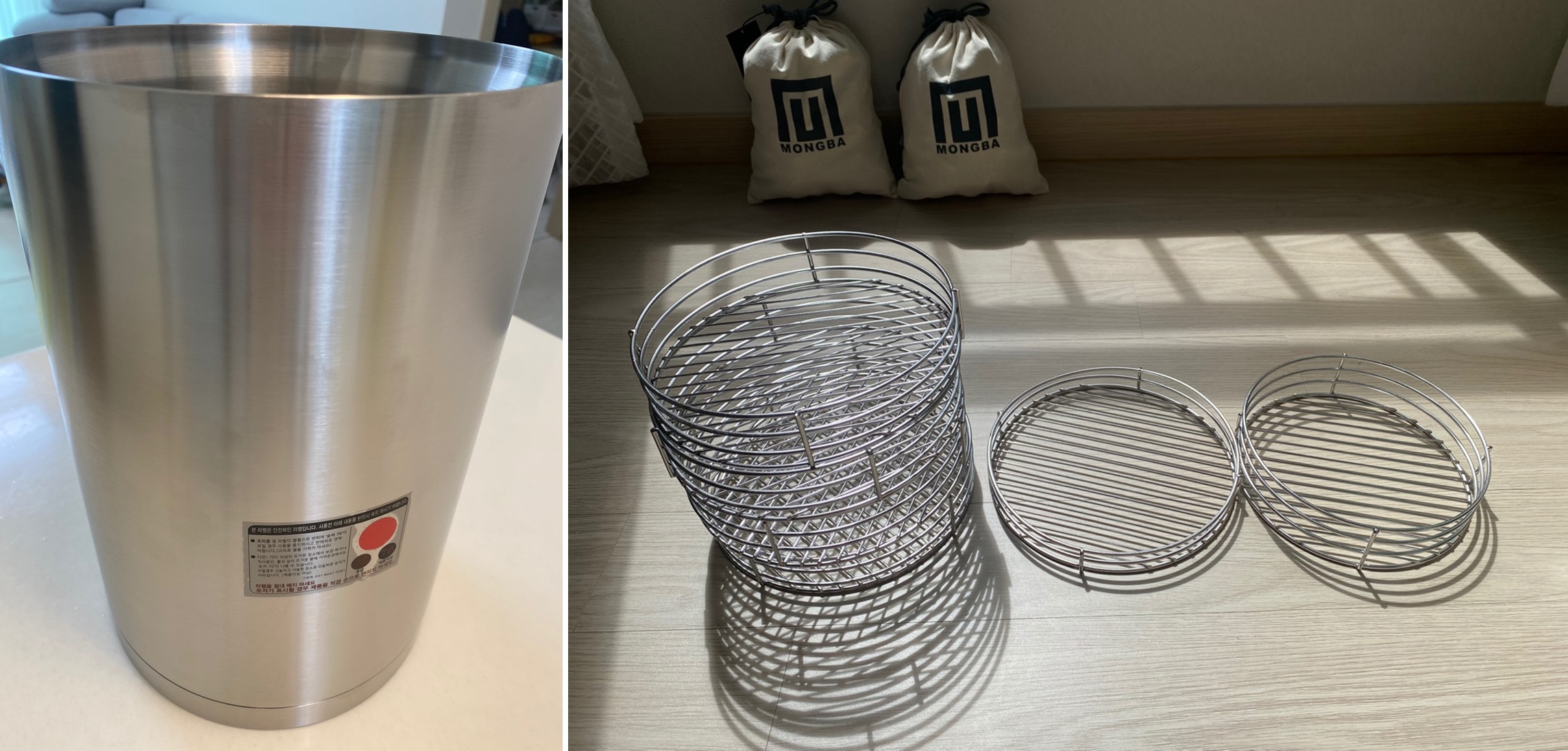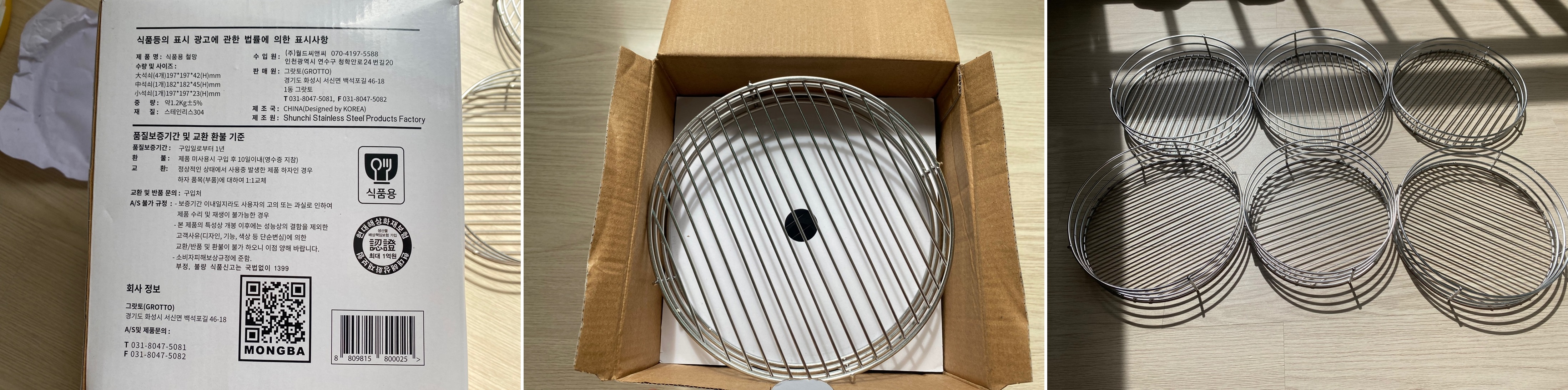 석쇠망은 모두 6개가 1 세트로 원형이 작은 석쇠망은 맨 아래에 들어가는 석쇠고 높이가 낮은 석쇠는 야채를 넣을 때 사용하는 망입니다. 모두 꺼냈습니다!